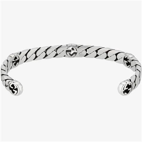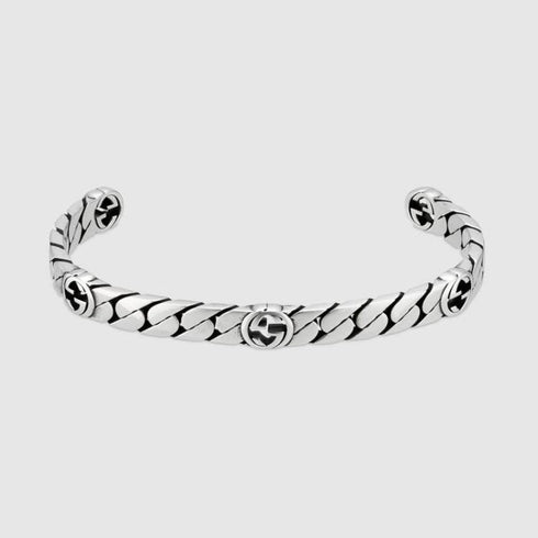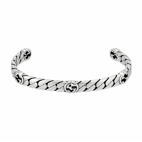 Description du produit : Le bracelet manchette en argent sterling Gucci Interlocking G témoigne du design emblématique de la marque et de son savoir-faire exceptionnel. Fabriqué en argent sterling 925, ce bracelet manchette unisexe présente une série de cinq motifs G imbriqués, les initiales de Guccio Gucci, le fondateur de la célèbre maison de couture italienne. La largeur de la bande de 6 mm offre une esthétique élégante et contemporaine, ce qui en fait un accessoire polyvalent convenant à diverses occasions.