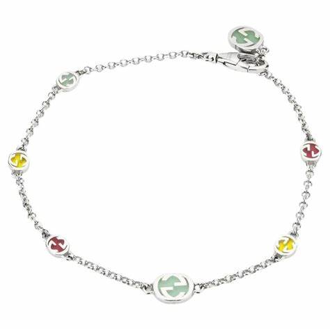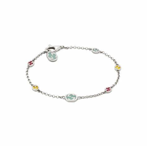 Description du produit : Le bracelet en argent sterling Gucci Interlocking G Multicoloured Enamel Sterling Silver Bracelet met en valeur l'emblème de la marque dans un design vibrant et contemporain. Fabriqué en argent sterling 925, ce bracelet présente une délicate chaîne gourmette ornée de multiples motifs G imbriqués, chacun rehaussé d'émail coloré dans les tons rouge, vert et jaune. Le fermoir réglable assure un ajustement confortable, ce qui en fait un accessoire polyvalent convenant à diverses occasions.
