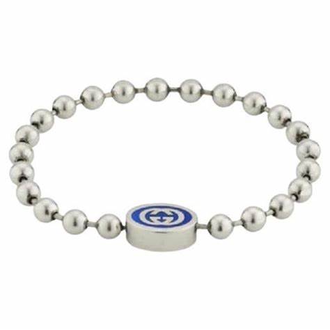 Le bracelet Gucci Interlocking G Boule Chain est un accessoire moderne et élégant qui met en valeur le style caractéristique de la marque. Fabriqué en argent sterling 925, ce bracelet présente un design unique de chaîne boule. En son centre, le motif emblématique du G imbriqué est rehaussé d'un émail bleu vibrant, ajoutant une touche de sophistication et de couleur. Le fermoir sécurisé assure un ajustement confortable, ce qui le rend parfait pour un usage quotidien ou pour des occasions spéciales.