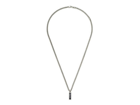 Description du produit : Ce collier Gucci contemporain présente un pendentif en émail noir gravé de l'emblématique écriture " Gucci ", suspendu à une chaîne en argent sterling. Son design minimaliste et ses matériaux de haute qualité en font un accessoire polyvalent adapté à toutes les occasions.