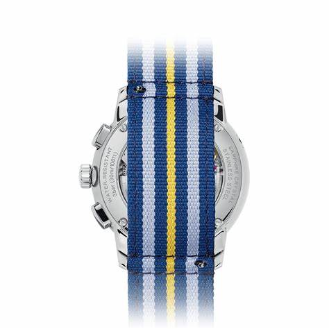 Mido Mod. M027-625-17-031-00 Boîte officielle Description du produit : La Mido Baroncelli Chronograph Moonphase M027.625.17.031.00 est une pièce d'horlogerie distinguée qui allie harmonieusement l'artisanat suisse traditionnel à la technologie horlogère moderne. Logée dans un boîtier en acier inoxydable de 42 mm, cette montre présente un captivant cadran argenté orné d'aiguilles et d'index luminescents de couleur argentée. Le cadran est protégé par un verre saphir inrayable, gage de durabilité et de clarté. Animée par le mouvement automatique Mido Calibre A05.221, elle offre une impressionnante réserve de marche de 60 heures. La montre est étanche jusqu'à 30 mètres, ce qui permet de la porter au quotidien. Un bracelet en cuir bleu avec boucle déployante complète le design général, offrant à la fois confort et style. Le fond transparent du boîtier permet de voir le mouvement complexe.