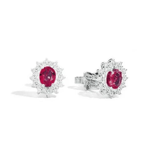 Description du produit : Les boucles d'oreilles Recarlo Camelia E77CC001/RB incarnent le savoir-faire italien, avec d'exquis rubis ovales entourés d'un halo de diamants taillés en brillant et sertis dans de l'or blanc 18 carats.