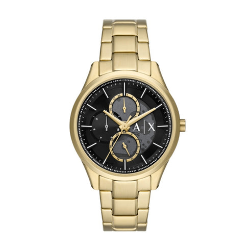 Product Description: The Armani Exchange AX1875, part of the Dante collection, is a sophisticated men's watch that seamlessly blends modern design with practical functionality. Its luxurious gold-tone stainless steel construction and black sunray dial make it a versatile accessory suitable for both casual and formal occasions.