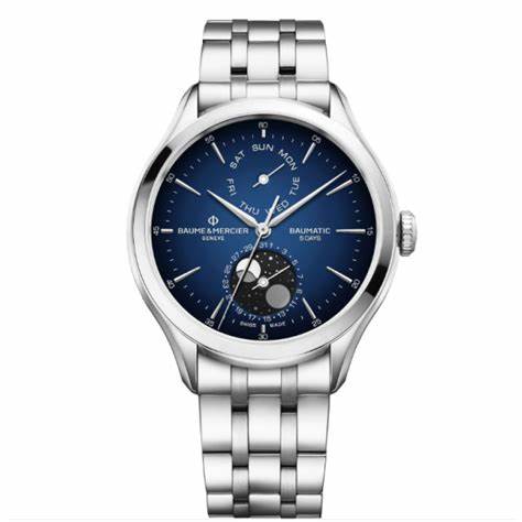 Baume & Mercier Clifton MOA10725 Men's Automatic Watch - 42mm Stainless Steel Case, Blue Lacquered Dial, Day-Date, Moon Phase, Stainless Steel Bracelet