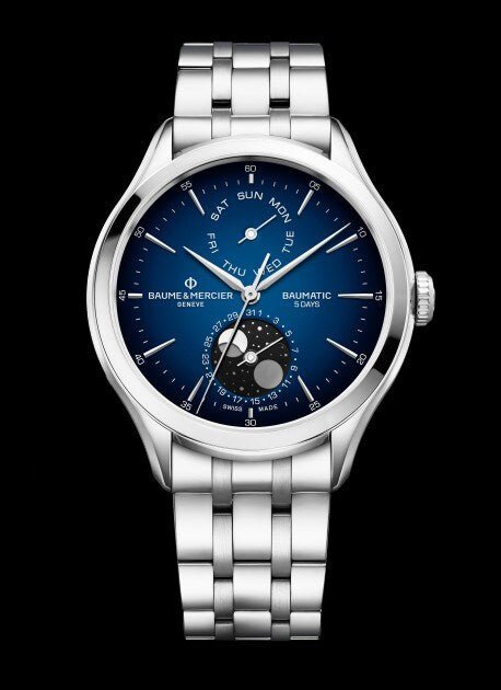Movement: Powered by the in-house Baumatic BM13-1975A automatic movement, this watch offers a remarkable power reserve of approximately 120 hours, ensuring precise timekeeping.Case: The 42mm polished stainless steel case houses a gradient blue lacquered dial that opens up at 6 o’clock to show a starry sky through a transparent gray sapphire crystal. A polished rhodium-plated black lacquered moon disk illuminates the decor. The day appears in an aperture at 12 o’clock, facing the date at 6 o’clock in perfect symmetry. Rhodium-plated riveted indexes with a slightly elongated trapezoid shape adorn the dial Bracelet: The stainless steel bracelet complements the case, providing a seamless and elegant appearance. It is secured with a triple-folding clasp with security push-pieces, ensuring a comfortable and secure fit Water Resistance: With a water resistance rating of up to 50 meters (5 ATM), this watch is suitable for daily wear and can withstand minor splashes.