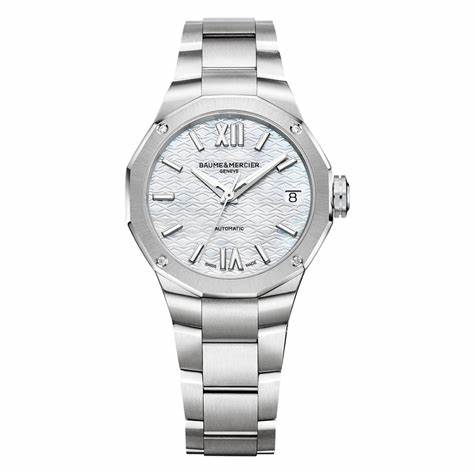 Baume & Mercier Riviera MOA10676 Women's Automatic Watch - 33mm Stainless Steel Case, White Mother-of-Pearl Dial, Diamond-Set Bezel, Steel Bracelet