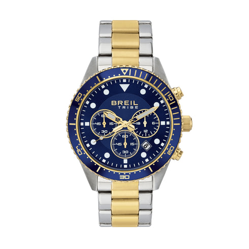 The Breil Sail EW0744 is a men's chronograph watch that combines sporty elegance with nautical inspiration. Crafted from two-tone stainless steel in silver and gold, it features a striking blue dial and bezel accented with gold-tone details.With its 42mm case and water resistance up to 100 meters, this timepiece is both stylish and functional, suitable for various occasions