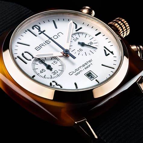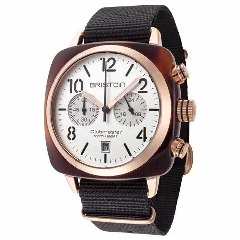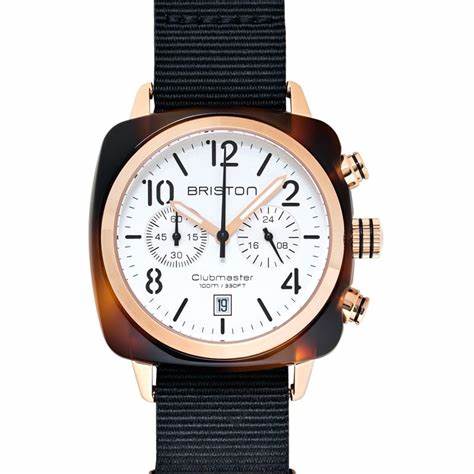 The Briston Clubmaster Classic Chronograph Watch (Model: 17140.PRA.T.2.NB) is a sophisticated timepiece that seamlessly blends modern design with functional features. It features a 40mm tortoiseshell acetate case with a polished rose gold finish, complemented by a white dial. The dial includes chronograph functions, with a 60-minute counter at 9 o'clock and a 24-hour counter at 3 o'clock, along with a date display at 6 o'clock. The rhodium-plated hands with white Superluminova® inserts ensure clear readability in various lighting conditions. Protected by a domed mineral crystal, the watch is water-resistant up to 100 meters (10 ATM), making it suitable for swimming and snorkeling. It is powered by a reliable Miyota OS21 quartz movement and comes with an interchangeable black NATO-style strap with rose gold steel buckles