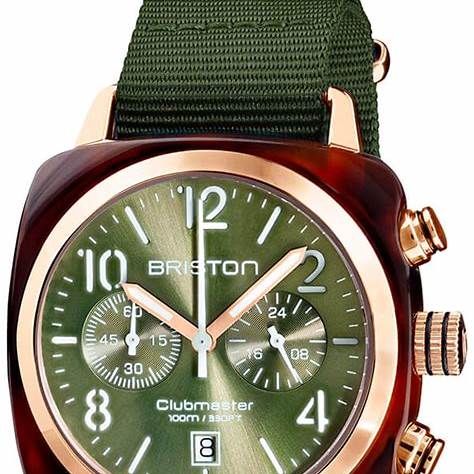 The Briston Clubmaster Classic Chronograph (Model: 19140.PRA.T.26.NOL) is a sophisticated timepiece that seamlessly combines modern design with functional features. It features a 40mm stainless steel case with a rose gold finish and tortoiseshell acetate, complemented by a sunray green dial. The watch is powered by a Miyota OS21 quartz movement, offering precise timekeeping. It is water-resistant up to 100 meters (10 ATM), making it suitable for swimming and snorkeling. The watch comes with an interchangeable green NATO-style strap with rose gold steel buckles, providing both style and comfort for everyday wear