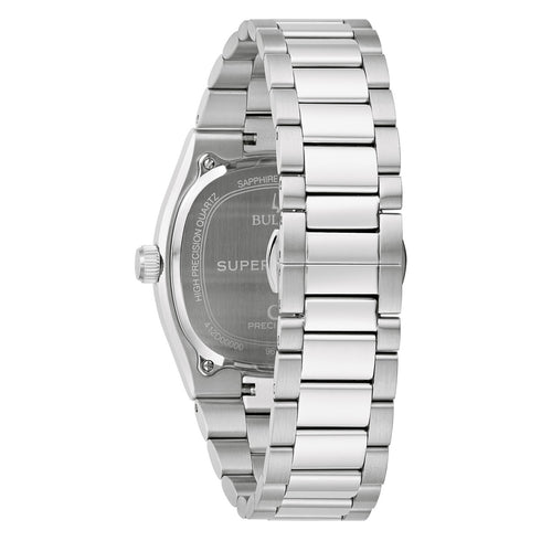 The watch is adorned with a grooved coin-edge bezel and protected by a flat anti-reflective sapphire crystal, enhancing both its durability and legibility. The integrated 3-link stainless steel bracelet, secured with a push-button deployant clasp, offers both comfort and style. With its blend of classic design and cutting-edge technology, the Super Seville 96B440 is a testament to Bulova's commitment to excellence