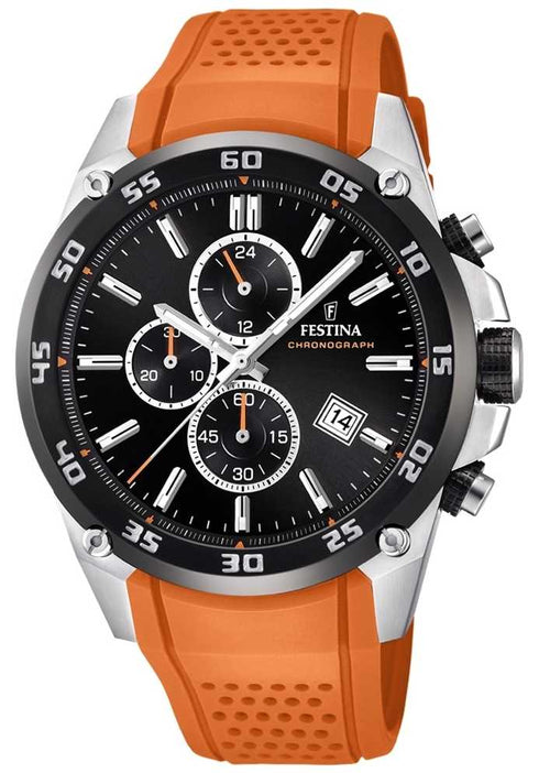 Festina F20330/4 Men's Chronograph Watch – Black Dial, Orange Strap, 47mm, 100m WR