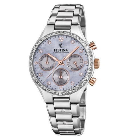 Festina F20401/3 Ladies Chronograph – Silver Stainless Steel, Blue Mother-of-Pearl Dial