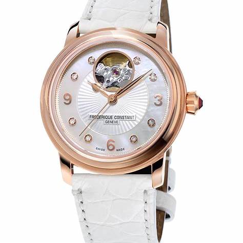- Movement: Automatic movement, caliber FC-310, featuring 26 jewels, operating at 28,800 vibrations per hour, with a power reserve of approximately 38 hours Case Material: Rose gold-plated stainless steel case with a diameter of 34 mm and a thickness of 9.9 mm Water Resistance: Up to 60 meters (6 ATM), suitable for everyday wear and light water activitiesThis Frederique Constant Heart Beat watch combines luxurious materials with intricate design elements, making it a perfect accessory for those seeking both functionality and elegance