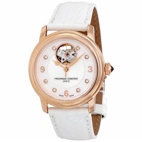 Frederique Constant FC-310HBAD2P4 Women's Heart Beat Automatic Watch - Rose Gold-Plated Case, Diamond-Set Mother-of-Pearl Dial, White Alligator Leather