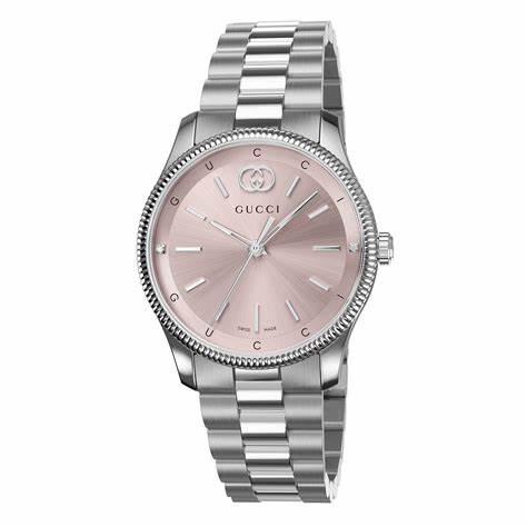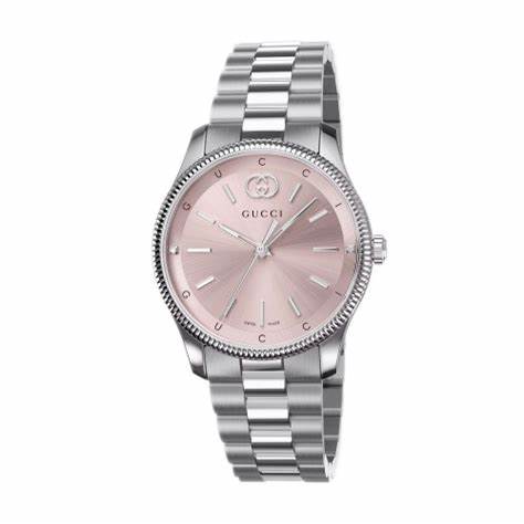 - Dial: Pink with silver-tone hands and index hour markers, featuring the Interlocking G and Gucci lettering, ensuring clear readability and a unique aesthetic.