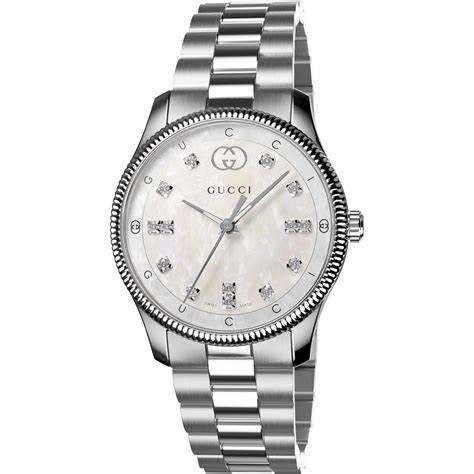 - Dial: White mother of pearl adorned with diamond hour markers, featuring the Interlocking G and Gucci lettering, ensuring clear readability and a luxurious aesthetic.