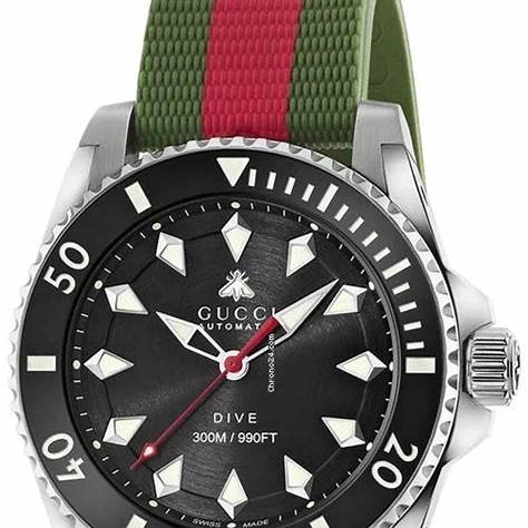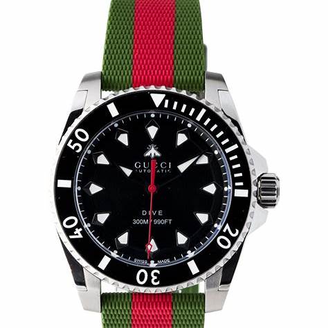 - Strap: Green and red rubber strap, reflecting Gucci's signature color scheme, with a stainless steel folding buckle for secure fastening.