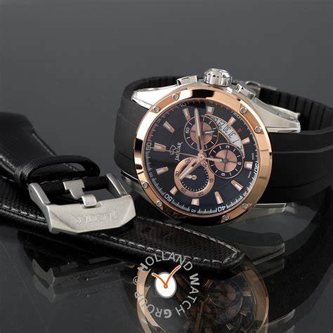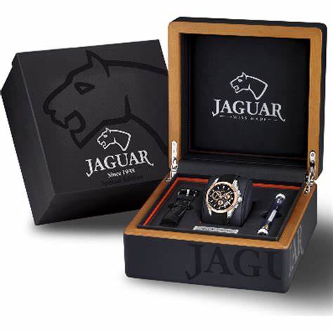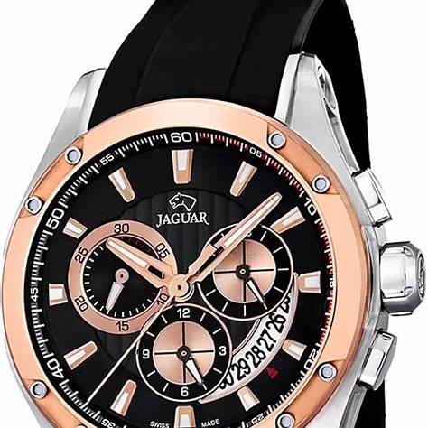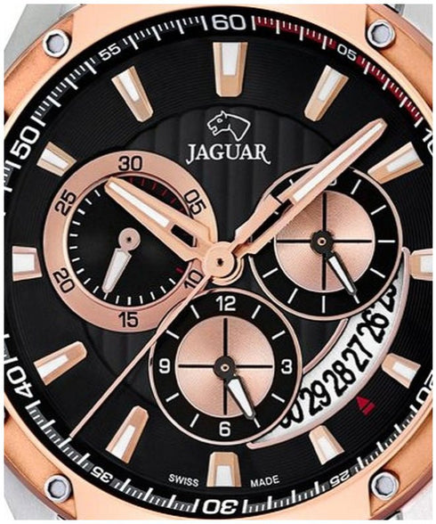 The Jaguar Model J689/1 is a distinguished men's timepiece from the Special Edition collection, showcasing Swiss craftsmanship and a sporty aesthetic. It features a robust stainless steel case with rose gold PVD accents, measuring 45mm in diameter and 15mm in thickness, providing a substantial yet comfortable presence on the wrist. The black dial is accented with rose gold-tone hands and hour markers, ensuring clear readability, and includes chronograph sub-dials for precise time measurement. A date display is conveniently located between the 4 and 5 o'clock positions. Powered by a reliable Swiss quartz movement, it guarantees accurate timekeeping. The watch is protected by a scratch-resistant sapphire crystal and is water-resistant up to 100 meters (10 ATM), making it suitable for swimming and snorkeling. The black rubber strap, equipped with a deployment clasp, adds a sporty touch to this versatile timepiece.