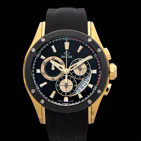 The Jaguar Model J691/2 is a distinguished men's timepiece from the Special Edition collection, showcasing Swiss craftsmanship and a sporty aesthetic. It features a robust stainless steel case with gold PVD plating, measuring 45mm in diameter and 15mm in thickness, providing a substantial yet comfortable presence on the wrist. The black dial is accented with gold-tone hands and hour markers, ensuring clear readability, and includes chronograph sub-dials for precise time measurement. A date display is conveniently located between the 4 and 5 o'clock positions. Powered by a reliable Swiss quartz movement, it guarantees accurate timekeeping. The watch is protected by a scratch-resistant sapphire crystal and is water-resistant up to 100 meters (10 ATM), making it suitable for swimming and snorkeling. The black rubber strap, equipped with a deployment clasp, adds a sporty touch to this versatile timepiece.