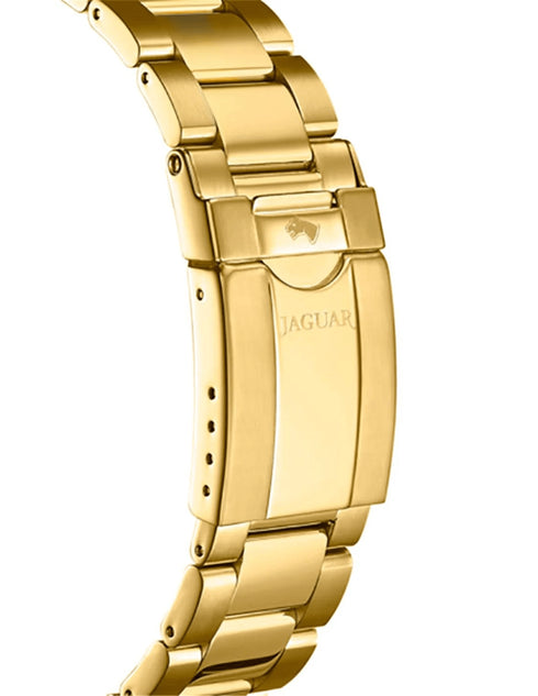 The Jaguar Model J899/2 is a distinguished men's hybrid timepiece that seamlessly blends traditional Swiss craftsmanship with modern smart functionalities. This watch features a robust 45 mm gold-tone stainless steel case and bracelet, exuding both luxury and durability. The striking blue dial is protected by a scratch-resistant sapphire crystal, ensuring clarity and resilience