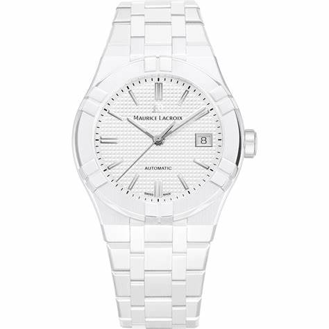 Product Description: The Maurice Lacroix AIKON Automatic Ceramic 39mm (Model: AI6007-CRM72-130-7) is a sophisticated timepiece that seamlessly blends urban-inspired aesthetics with Swiss craftsmanship. This model features a 39mm white ceramic case with a polished finish, offering a sleek and modern appearance. The white lacquered dial is adorned with rhodium-plated indexes and hands, both coated with white Super-LumiNova for enhanced readability in various lighting conditions. A date display is conveniently positioned at the 3 o'clock mark.