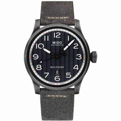 WR: 10 ATM - Case: 44 mm - Gender: Men - Case Material: SS IP Black - Strap Material: Leather Strap - Functions: Data - Glass: Sapphire - Product Type: Wristwatch - Made in: Switzerland - Packaging: Official BoxProduct Description: The Mido Multifort M0326073605000 is a distinguished timepiece that seamlessly blends traditional Swiss craftsmanship with modern watchmaking technology. Encased in a 44mm stainless steel case with a gunmetal PVD coating, this watch features a striking navy blue dial adorned with luminous black hands and Arabic numeral hour markers. The dial is protected by a scratch-resistant sapphire crystal, ensuring durability and clarity. Powered by the Mido Caliber 80.611 automatic movement, it offers an impressive 80-hour power reserve. The watch is water-resistant up to 100 meters, making it suitable for daily wear and light swimming. A grey leather strap with a tang clasp complements the overall design, providing both comfort and style. The transparent case back allows for a view of the intricate movement
